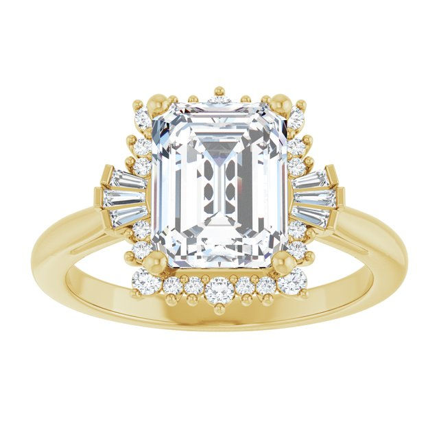 Lab-grown Diamond, 6 Tapered Baguette accent (Natural, GHI/VS) diamonds 0.09 CTW, 22 Round accent 0.17 CTW, Emerald shape center 2.85 Ct