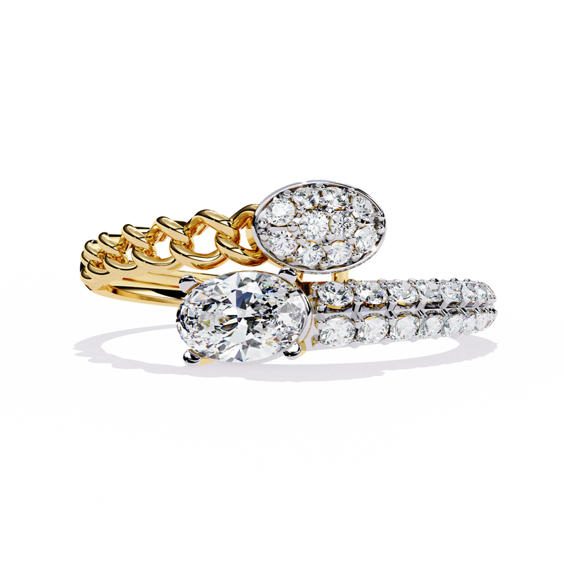A uniquely designed ring featuring a twisted shank, with one oval diamond center and another oval shape filled with round diamonds. One side of the shank showcases a chain-style design, while the other is adorned with double round diamonds covering a quarter of the band. A bold and artistic statement piece.