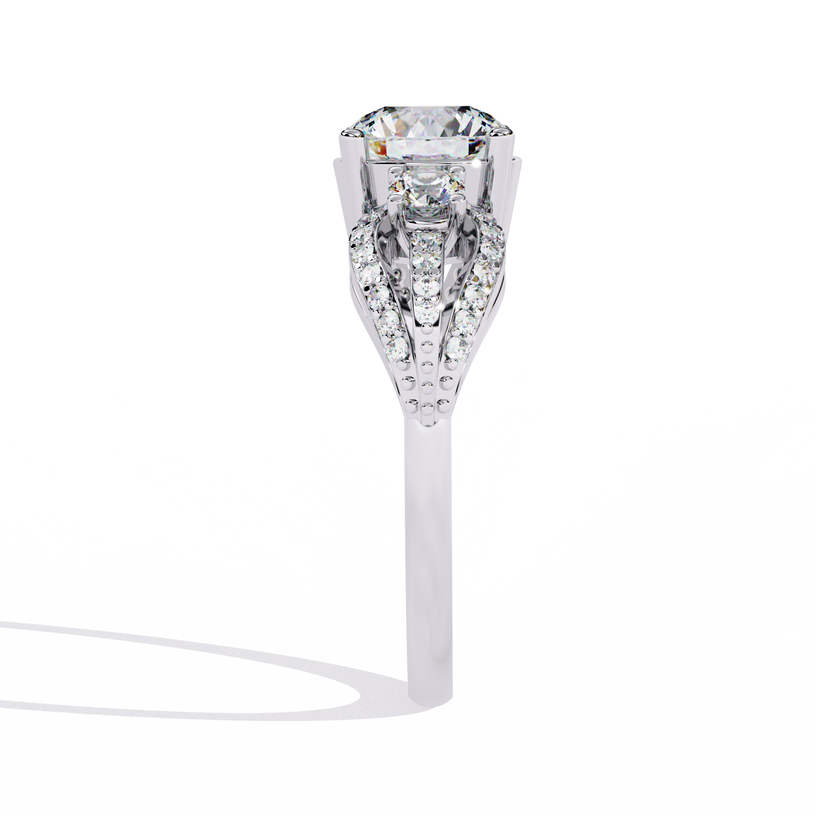 This captivating three-stone engagement ring features a breathtaking round center diamond, flanked by two intricately set round accent stones. Each side stone is embraced by a delicate infinity-style wrap, encrusted with shimmering pavé diamonds for added brilliance. The twisted shank design enhances the elegance of this masterpiece, making it a symbol of timeless love and sophistication.