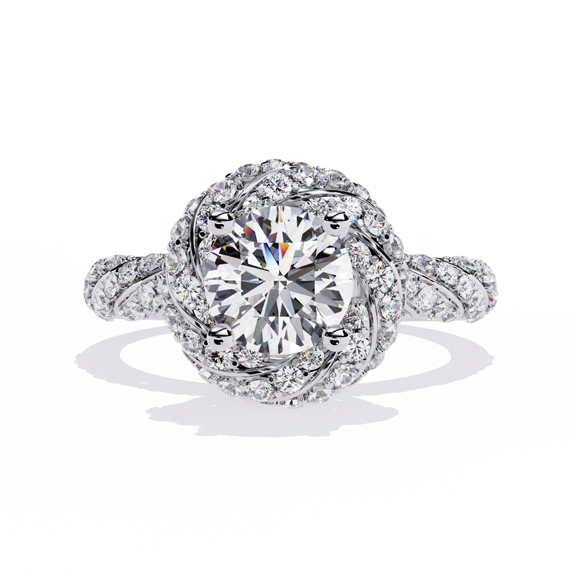 This engagement ring features a unique twisted design, combining modern elegance with timeless sophistication. At its heart, a brilliant round center stone is encircled by a halo of dazzling round diamonds, enhancing its radiance. The twisted shank, half adorned with accent diamonds, adds a dynamic and artistic touch, symbolizing the intertwining of two lives. Perfect for those seeking a distinctive yet classic engagement ring, this design offers exceptional sparkle and elegance.