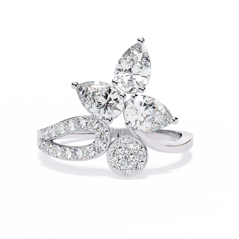 This elegant fashion ring showcases a stunning combination of pear and round diamonds, thoughtfully arranged to enhance its timeless appeal. The design balances modern refinement with classic charm, making it a perfect statement piece for any occasion. Whether worn alone or paired with other jewelry, this ring adds a touch of brilliance and sophistication to any collection.