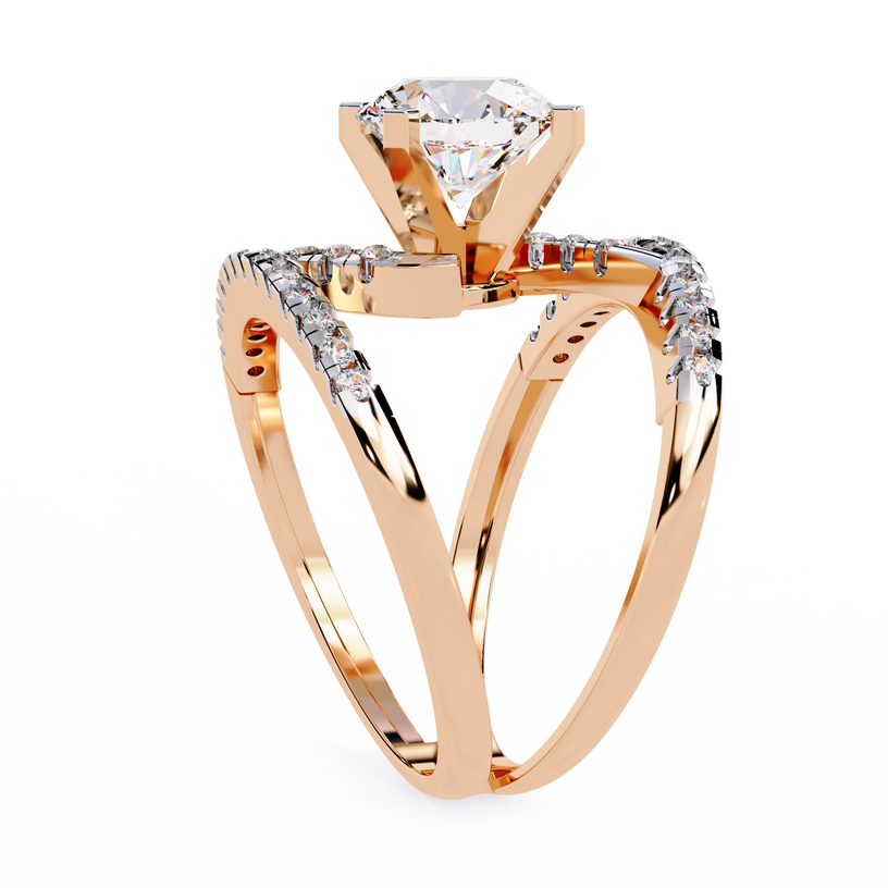 A captivating blend of elegance and movement, this ring showcases a striking round brilliant-cut diamond at its center. The double-band design gracefully wraps around the finger, creating a fluid, intertwined effect. Adorned with shimmering accent diamonds that follow the natural curves of the band, this exquisite piece embodies both sophistication and dynamic beauty—a perfect symbol of love and commitment.