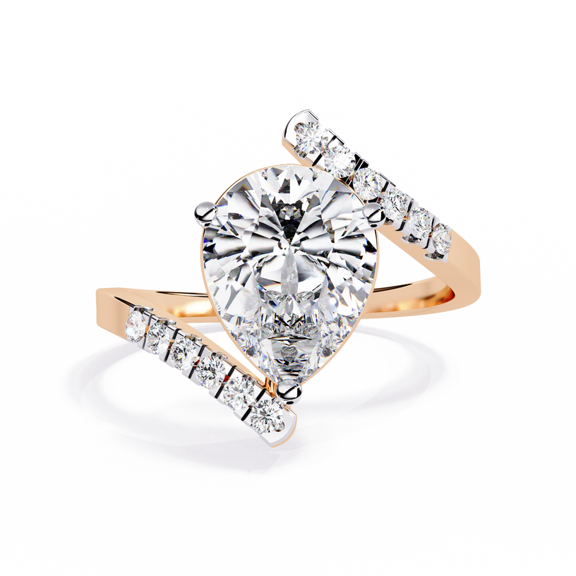 A contemporary take on timeless elegance, this ring features a stunning pear-shaped center diamond, held securely in a sleek prong setting. The asymmetrical open band wraps around the finger with effortless grace, adorned with a series of brilliant-cut diamonds that enhance its modern appeal. The dynamic design creates a striking visual effect, making this ring a captivating statement piece. It exudes sophistication with a bold, artistic flair.